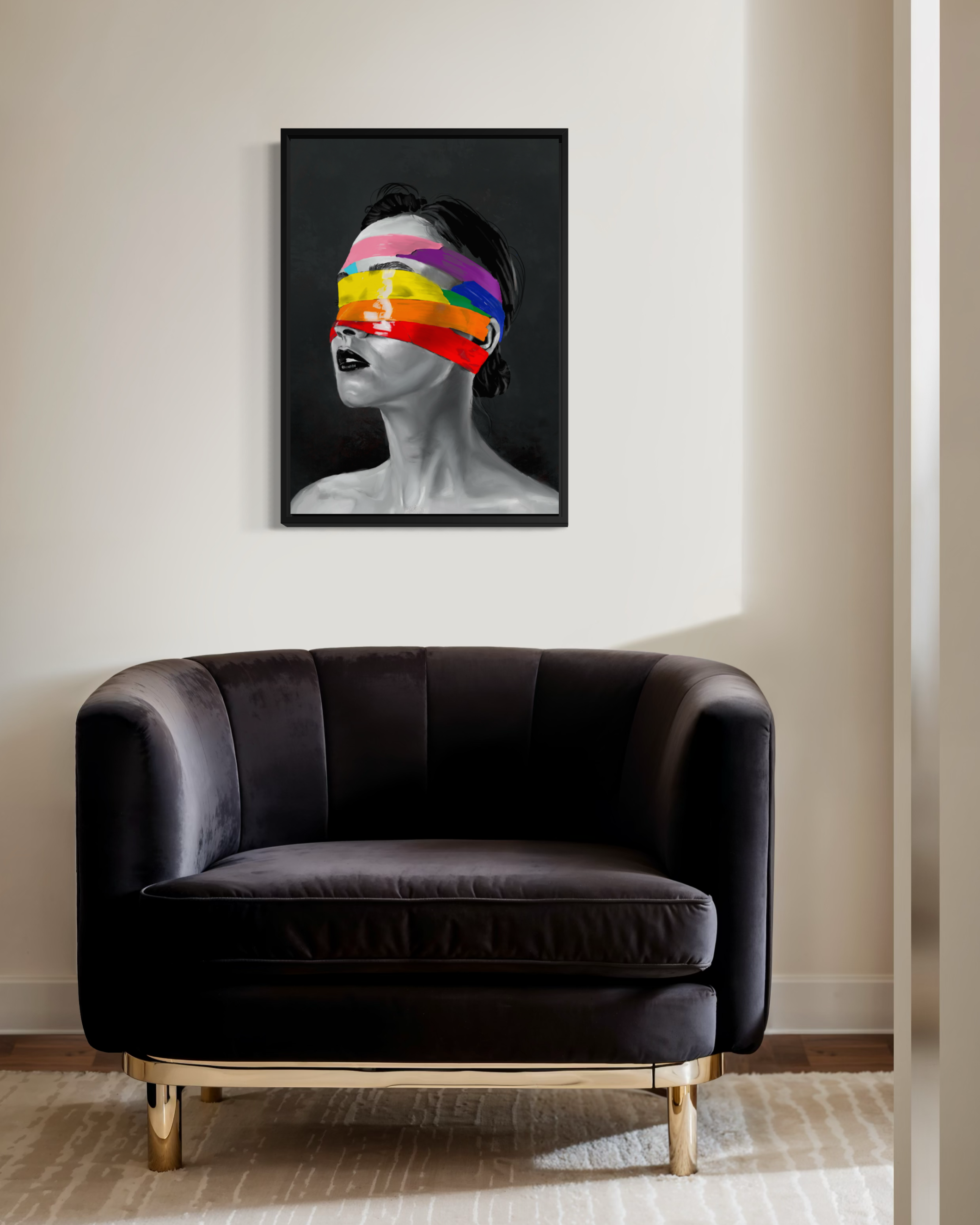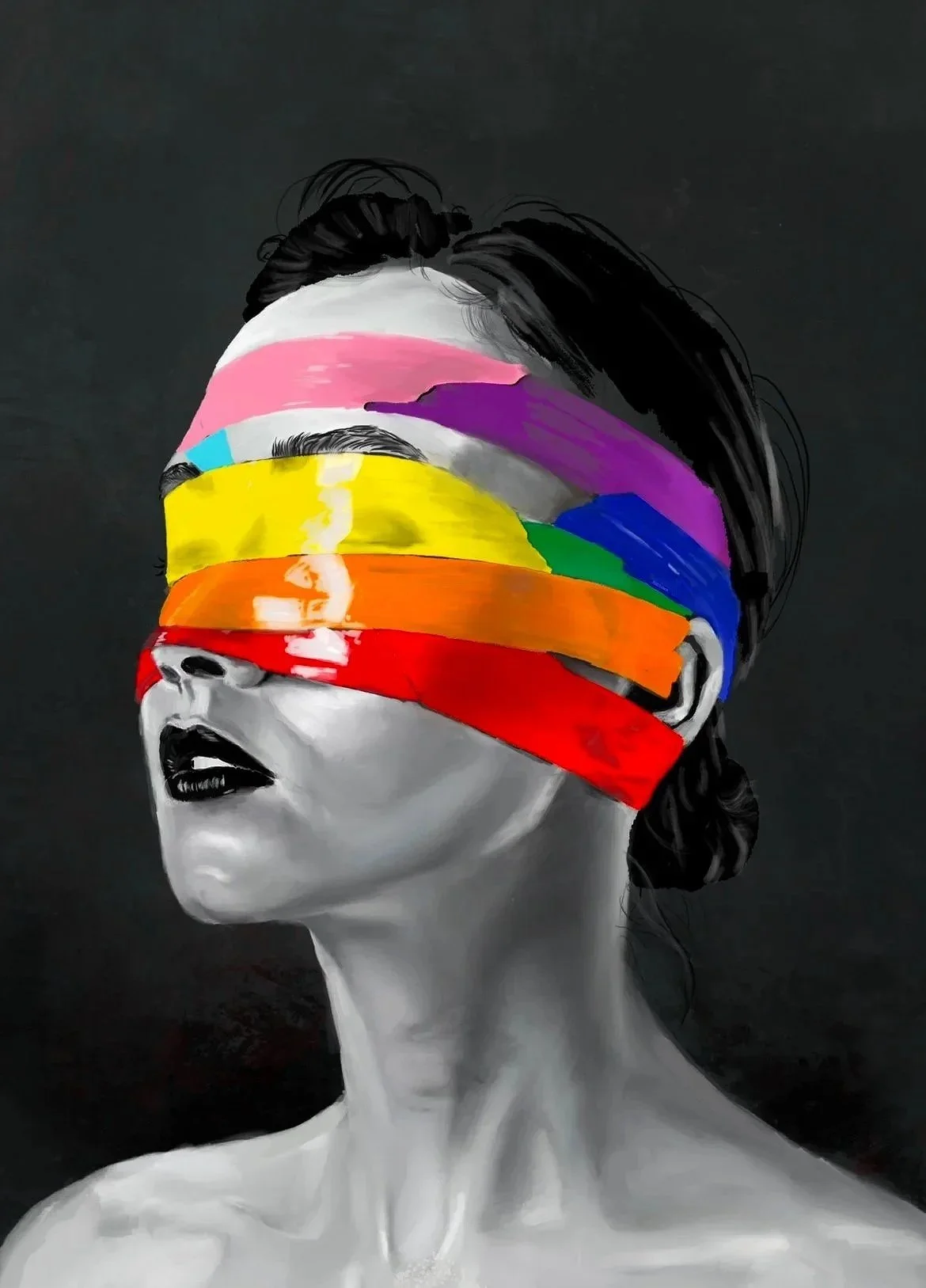 The portrait reveals the tension between exposure and concealment: the purity of the self, stripped of pretense, contrasted with the vivid colors of the rainbow flag that both shield and define. It asks the viewer to look deeper, beyond the labels, beyond the mask, and to truly see the person within.